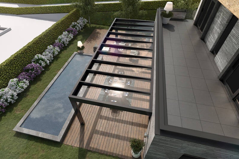 Deze kubistische terrasoverkapping is beschikbaar in twee varianten; aanbouw of vrijstaand. Aangemoedigd door uw wensen en innovatieve technologieën is het mogelijk om een grote vrije overspanning van 7000 mm te creëren. U bent daardoor vrij om uw overkapping in te richten zonder obstakels en u behoudt een onbelemmerd zicht.