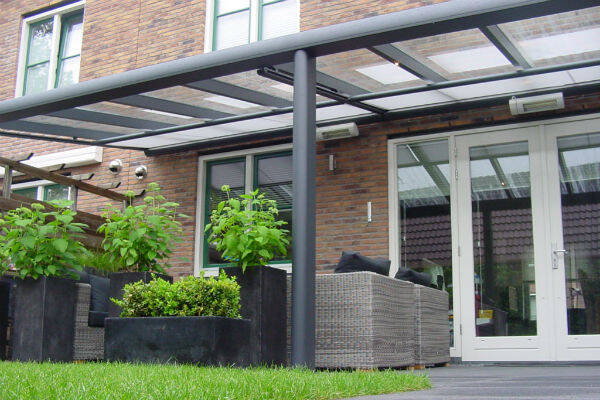 Pallazzo terrasoverkapping XL is dé oplossing als u een grotere vrije overspanning van de goot wilt. Dankzij een staalversteviging is een overkapping mogelijk van 6 meter breed en 4 meter diep met glas, met slechts twee palen. Grote voordelen hiervan zijn meer licht en een grotere vrije doorgang.